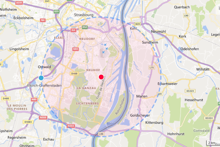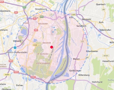 Profitez de la remise en main propre sans frais dans un rayon de 5 km autour du point rouge.