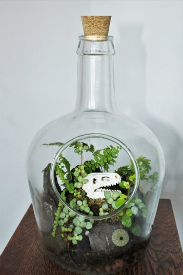 This desert terrarium, custom ordered by a client, displays rocks and shells which she picked on a beach during her holiday.